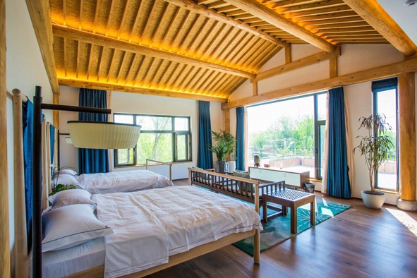 荷府的客房也是简约舒适,超大的空间囊括了落地观景窗和露天阳台,躺在柔软的大床上就能看到外面的风景,纵观整个村落,怡然自在。
