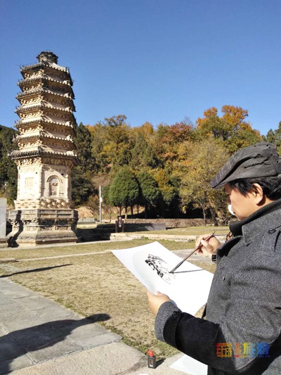 在参观了湖门村民宿后,昌平区文化和旅游局将昌平“幸福街坊”的荣誉徽章授予艺术家们,展现了昌平“幸福街坊”的快乐生活。穿过乡行如画的湖门村去往银山塔林,这里苍松翠柏,浓郁茂盛,银山辽塔藏觅于深谷间,银杏叶半掩更显辽塔壮美,可谓层林尽染满目秋色,行走其间,令大家赞叹不已。