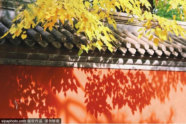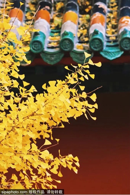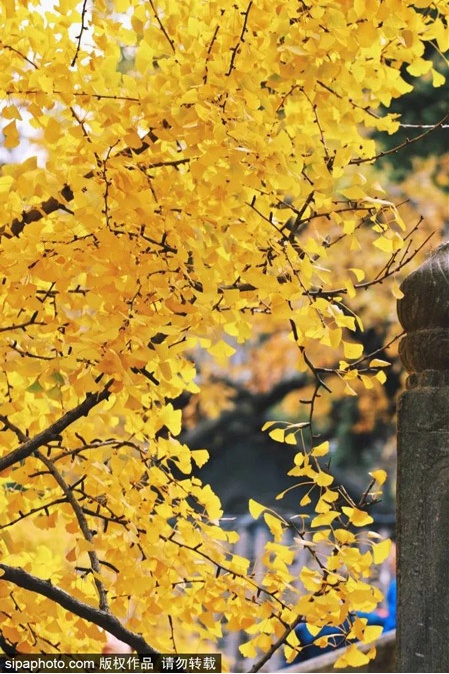 天气晴好的时候,这里随便拍一拍都像是大片,不需要复杂的色彩,银杏的黄加上天空的蓝和庙宇的红,怎么看都让人心醉~