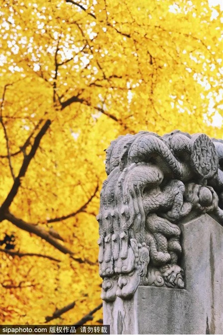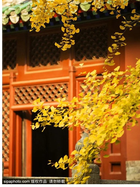 每年金秋时节,明黄的银杏扇叶会铺满整个庭院,高高枝干随性向四周伸展,与红墙灰瓦、禅房殿堂交相辉映,构筑起岁月沉淀后的别样美丽~