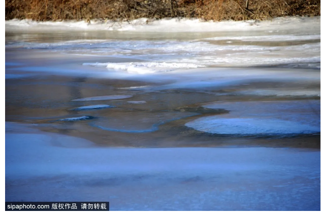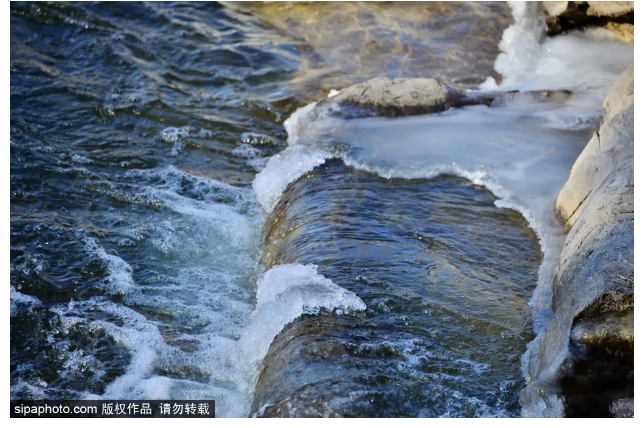 在陈家庄村旁的河道中,碎石组成的叠水平台加速了水体的流动,但下游的水面又盖着厚厚的冰层,河水从叠水平台落下,直接钻入冰层,形成了“水在冰下走”的冬日景观。