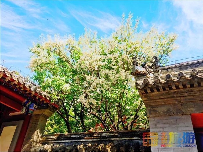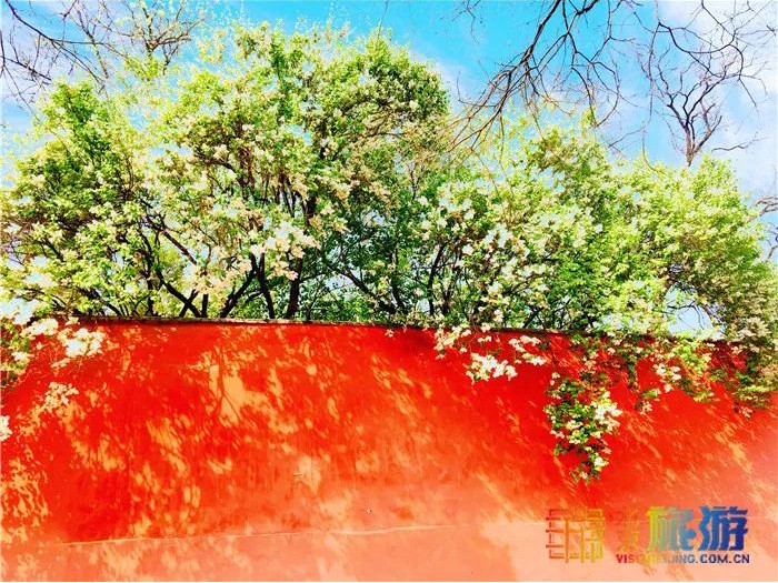 还没进门,就闻到一股香气,抬头一看,高高的红色围墙上探出不少枝丁香花,引得游人惊叹。