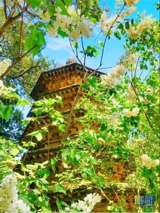 辽代佛塔依旧完好无损,这时节能看到花映古塔的美景。