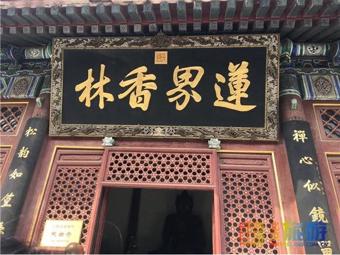 大雄宝殿正门的前额上挂着一块雕龙金匾,上面写着“莲界香林”四个大字,这是乾隆皇帝的御笔。