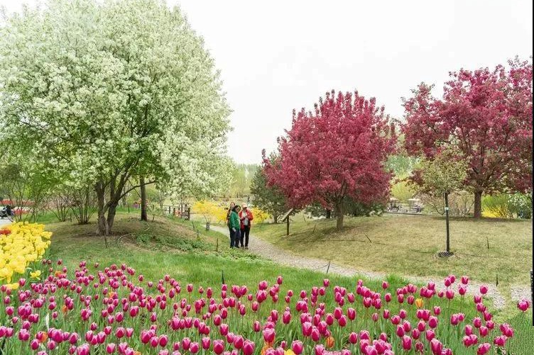京林生态花园核心景观区展示17个品种、10种花色郁金香,共10万余株,靓丽的黄色、橙色,表达了我们战胜疫情的心情;温馨的粉色、红色象征着人们对美好生态环境的追求和向往。此外,众多品种的玉兰花、樱花、月季、丁香、海棠、蓝叶忍冬、萱草、鸢尾、时令花卉等几十种植物陆续盛开。苗圃踏青区同步展示丛生元宝枫、丛生红叶李、丛生白蜡、茶条槭、小叶鸡爪槭、造型松、榆叶梅等。在品种丰富化、多元性展示的同时,也希望能给游客带来更多舒心惬意的绿色体验。
