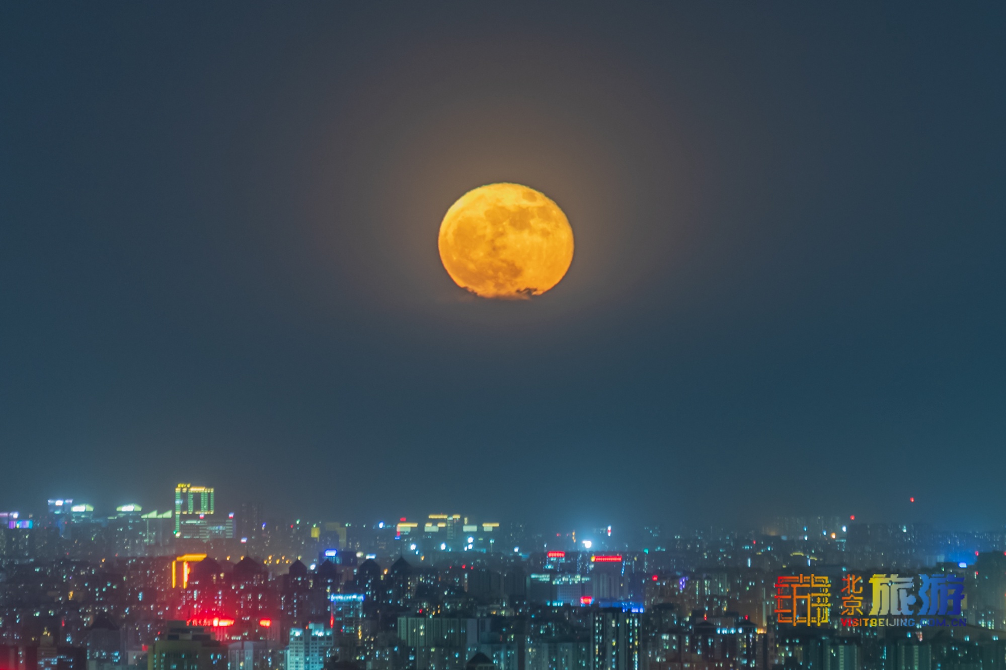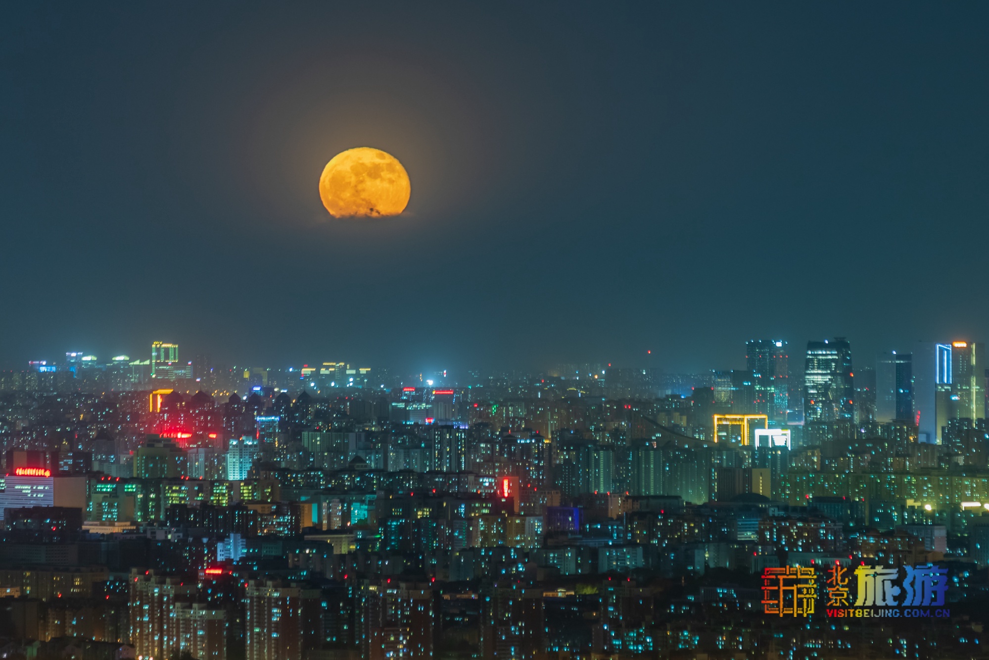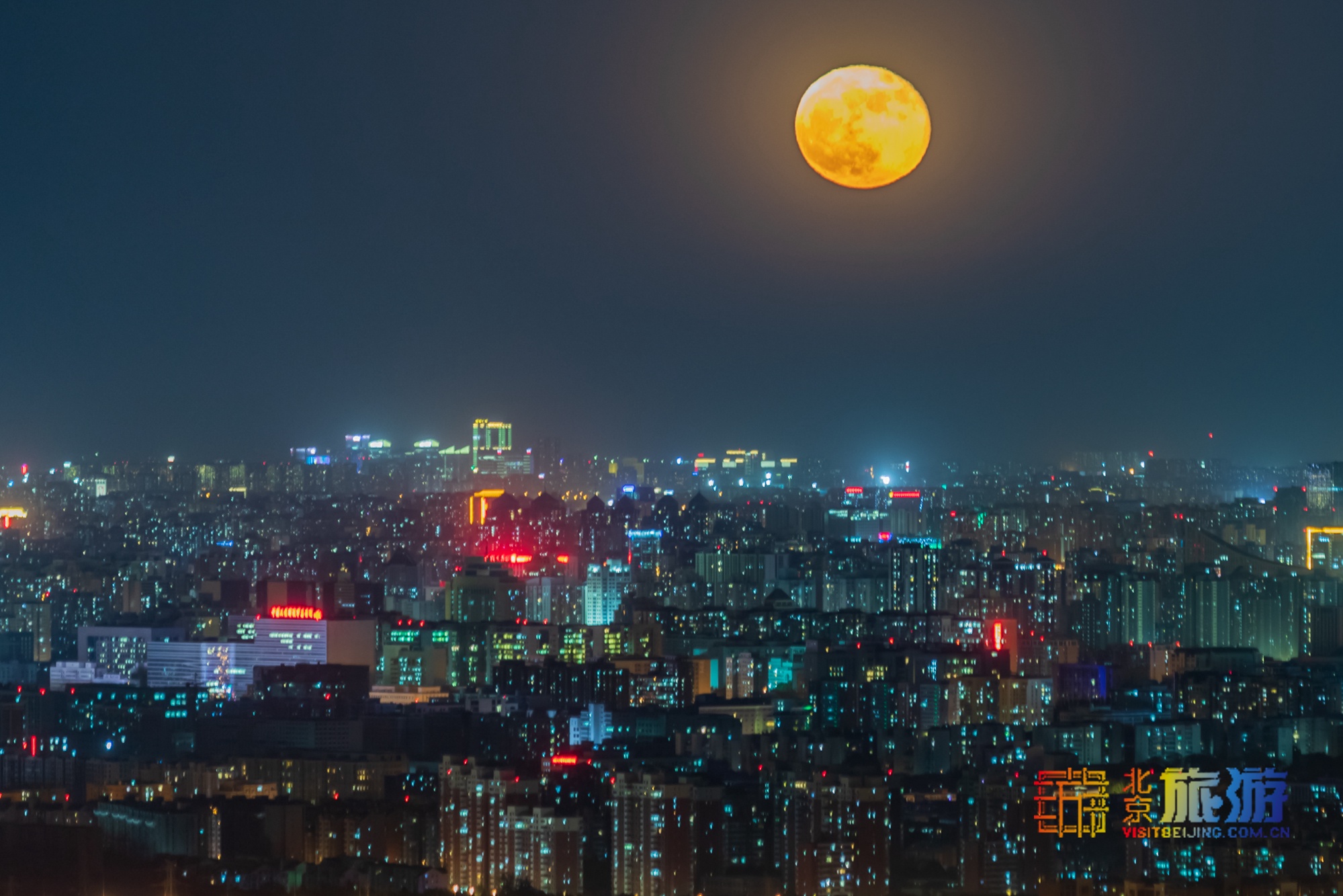 2021年5月27日,阴历四月十六,北京西山-虎头山,夜空中,明月高悬,“十五的月亮十六圆”;灯光璀璨,京城美轮美奂。