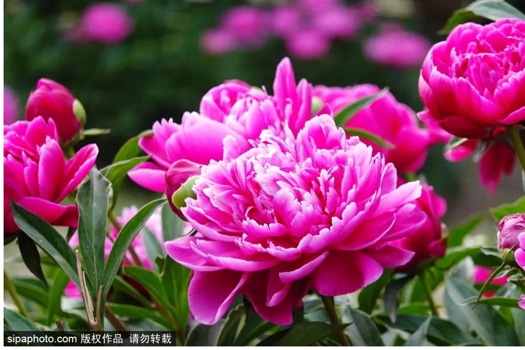 层层梯田里艳丽的芍药竞相开放,蜜蜂、蝴蝶在花丛中穿梭飞舞,派繁花似锦,花谷内千层台阁型的芍药花层多、朵大,与牡丹花极为相似,大片的芍药花吸引许多游客打卡拍照。