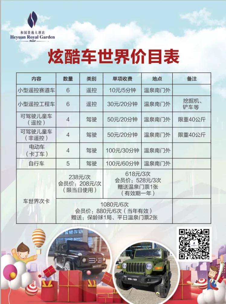 竞技遥控赛车、工程车,儿童驾驶车、电动车、自行车等多种车型。体验“速度与激情”的赛道,800亩天然氧吧自由骑行。炫酷车世界,满足大小朋友的驾驶快乐。