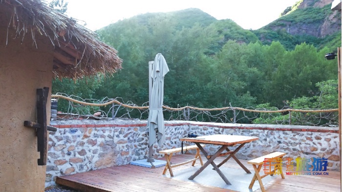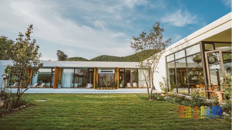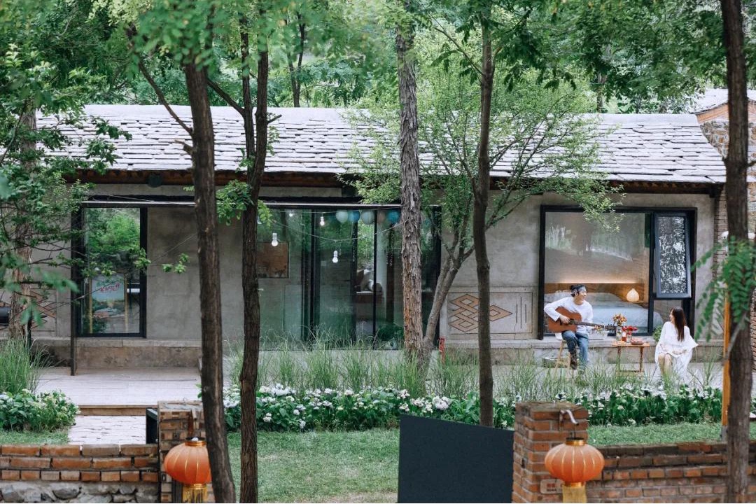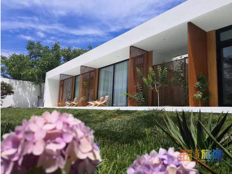 韩村河镇圣水峪村的圣水莲庭民宿就坐落在上方山山间,海拔约500米,山对面就是云水洞景区和上方山国家森林公园。这里四面环山,南靠清风岭,北面是莲花元宝山峰,可远眺官财山和卧佛山。两座院子外观风格迥异,绿荫当中一褐一白,交相呼应。所有房间都配置了北方少见的观景窗,通透敞亮,夏天椿林绿意满枝,冬天群山一览无余,让客人时刻都沉浸在大自然的怀抱里。