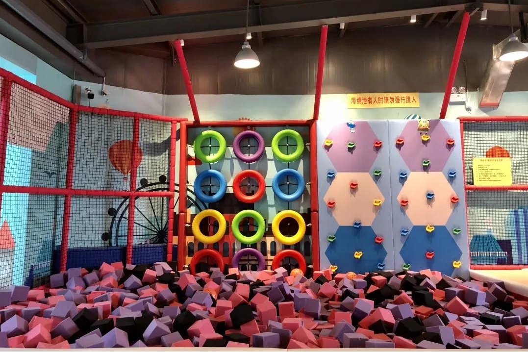 炫酷的蹦床区,攀岩区的色彩很有冲击力,绝对会让小朋友们蠢蠢欲动,底下是火爆Ins的海绵池,软软的非常舒服,所以超级安全~
