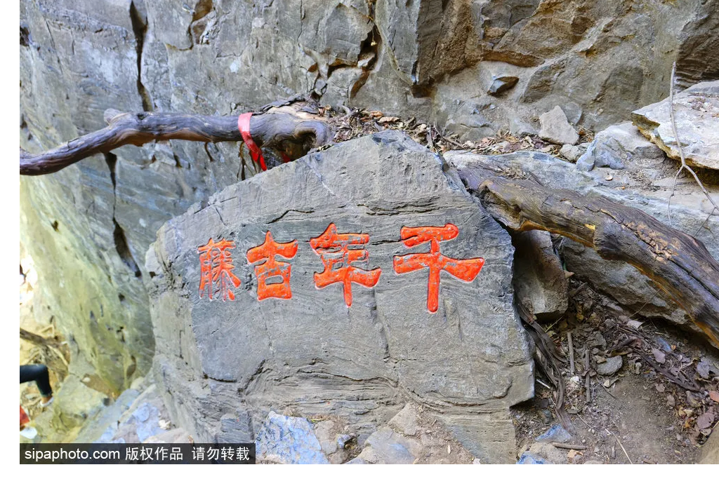 在一线天入口处,有一株野葡萄藤,据说已生长百年,至今仍能开花。