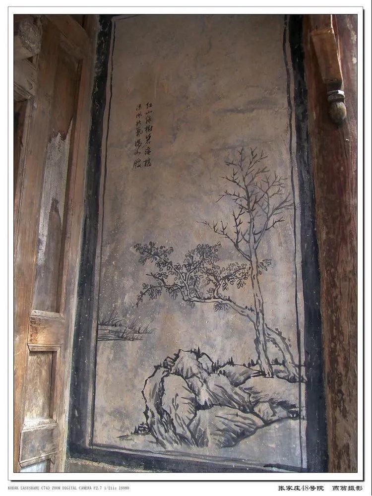 66号院的影壁保存较为完好,清水脊、蝎子尾带盘花,“福”字勾头,滴水雕花卉图案,“卍”字飞椽,圆椽头上刻着梅花图案,冰盘檐下层是勾连云纹,壁心上部为“卍”字不到头纹饰。院内正房的夹门窗以及簾架造型精美讲究,上面雕刻的动物和花卉图案繁杂细腻、做工精致,这一形式在民间的建筑中是很少见到。这座门前挂有“悦山庄”的院落也是一座古民居,位于村中两条主街之间,门楼门罩均分三段,为木雕“蝠(福)到眼前”图案,门楼左侧夹墙上绘有水墨国画,古朴别致。门道与前院倒座的下面以槛墙相隔,上面为四面木质隔扇。前院只有倒座两间,它的迎面是一座毁坏的影壁。后院已杂草丛生,但房屋保存的还算完好,里面正房五间,西面三间,两明一暗,东边两间,单开门。两侧夹门窗与门头窗是传统的工字步步锦样式,门头板为正方灯笼框,中间一间的窗子格式已经进行了改动,失去了原有样式。除此以外,院内还有西厢房三间,门窗样式与正房基本相同,只是门头板的图案改成了 “卍”字,槛墙由青砖砌成,硬山清水脊屋顶,蝎子尾已经损坏。另外,西厢房的屋内还开有一扇玻璃小窗,形制应该是后改的。对面东厢房的后墙上也开有一扇小窗,为支摘窗,方格样式。在这间厢房的南面墙上还开有一扇大窗,朝向里外院之间的甬道,窗的上面部分为方格样式,下面是玻璃的,玻璃两侧是传统的工字步步锦样式。