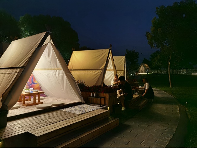 据了解,星巢露营区位于北京电影学院怀柔校区西侧,占地5000平方米,是杨宋镇综合文化中心的重要组成部分,分两期建设。其中,一期主打休闲餐饮,共设置11顶三角形精致帐篷,提供食材和烧烤工具等满足游客自助烧烤需求,夜间还将推出灯光秀,轻音乐演出等活动。二期主打休闲露营,设置生态小院,可供多人住宿,目前正在加紧筹备中。