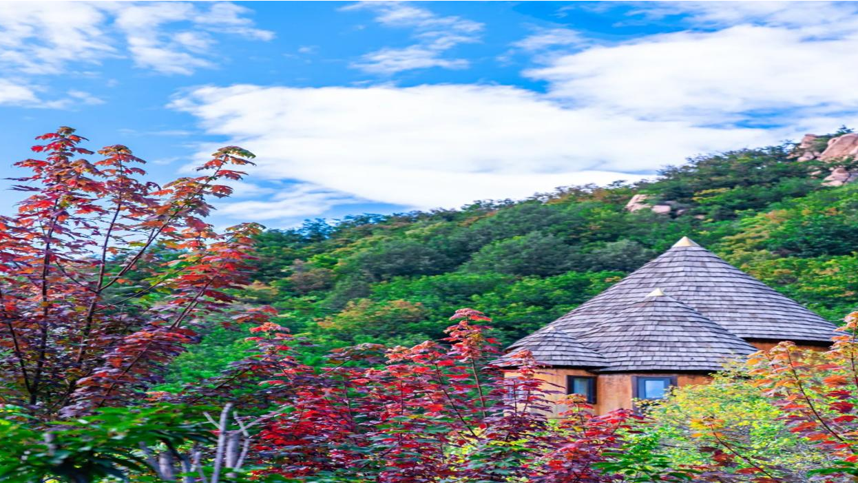 云峰山景色宜人,听林中阵阵鸟鸣,闻阵阵花香,绿的树,黄的草,红色叶,把整个云峰山点缀的色彩斑澜,漫步在范承勋古道,鼻尖萦绕着山间秋叶的味道,登高远望,宛如碧水清潭的密云水库,就像被放入色彩斑斓的丝绒里,倍感舒适。山谷中白色的莲花蘑菇帐,边享受下午茶,边欣赏红叶,在自家露台欣赏醉美的枫红时段。