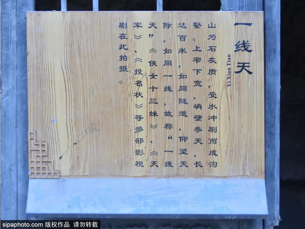 穿村而过,前往柏峪村的路上,有一片长达百米,如同隧道的山,受水冲刷成沟壑,仰望天际,如同一线,故称“一线天”。