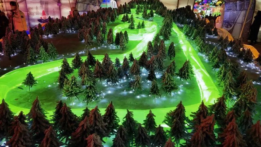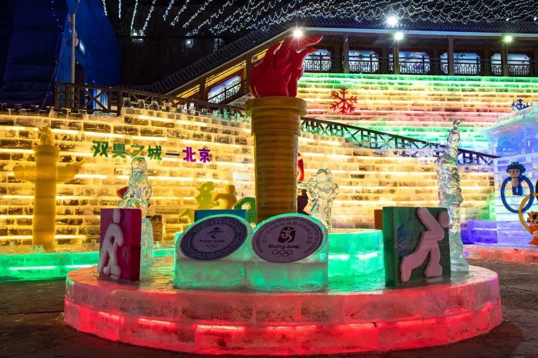 冬奥场馆“雪游龙”被工匠“搬到了”这里,一条状如“游龙”的冰制建筑从高处蜿蜒而下,穿越林木,灯光点亮,“游龙”变幻色彩,栩栩如生。游客可以不到赛区也能看到场馆全貌~