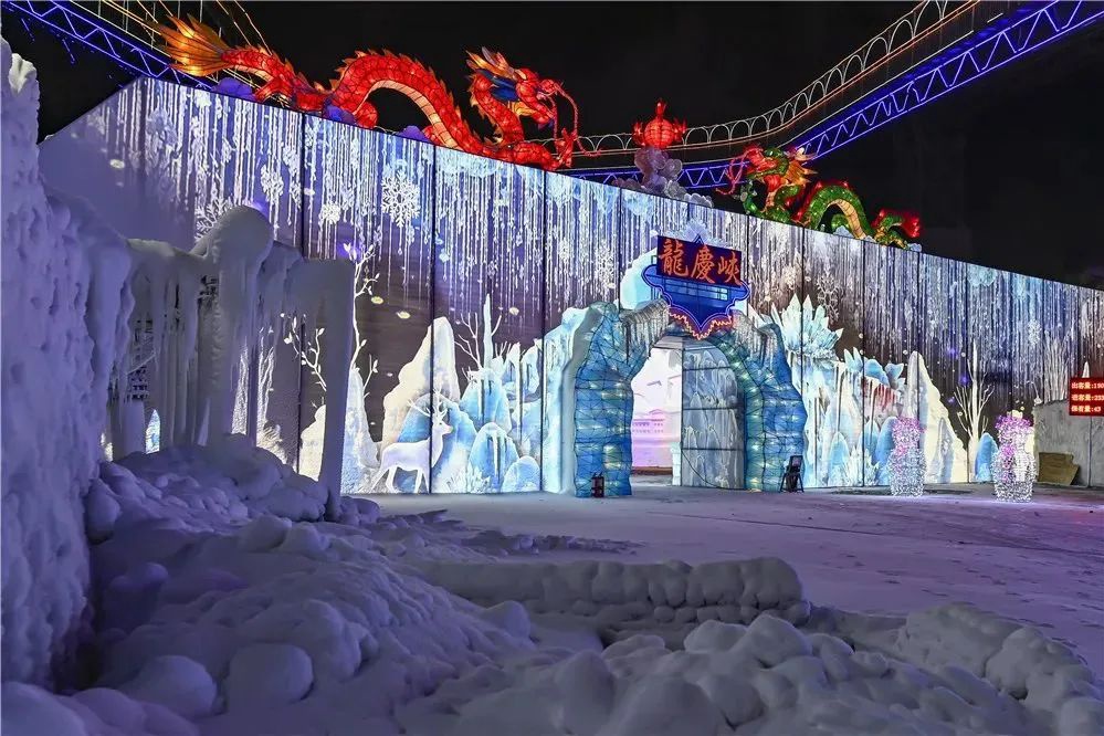 山间一条条灯带幻化出“彩龙出岫”的壮丽图景,成百上千组冰灯、花灯将龙庆峡装扮成绚烂的灯海。