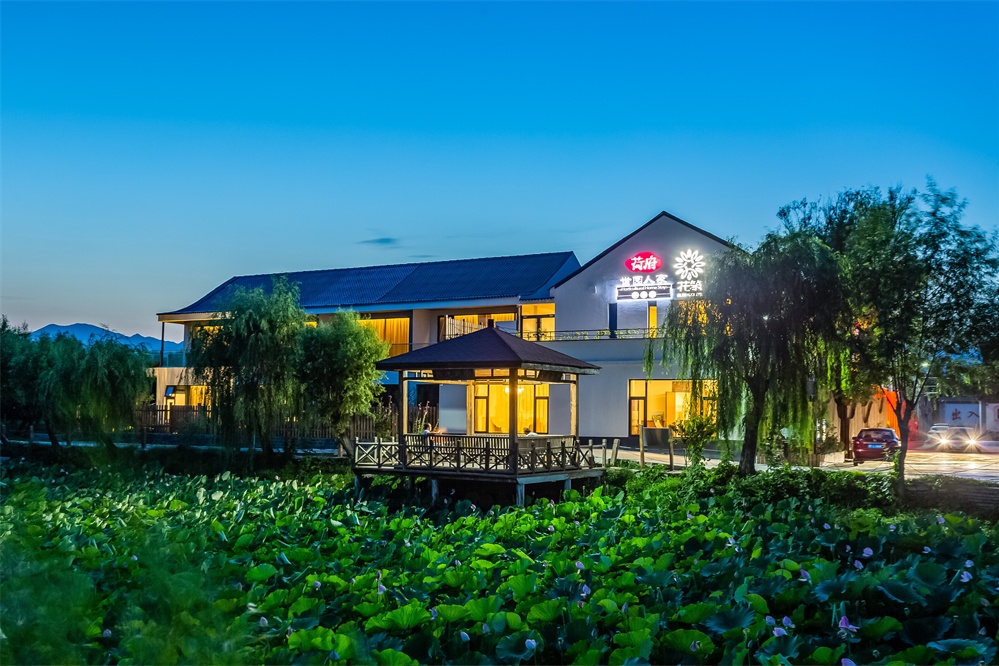 延庆荷府民宿位于康庄镇火烧营村,是一个长城脚下的世外桃源。民宿为灰砖青瓦,大木结构,落地大玻璃窗把室内外的风景连成一片,给人浑然天成的感官享受。