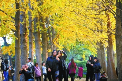 昨天,在钓鱼台银杏大道,人们踏秋赏景,拍照留念。伴随浓浓秋意,京城银杏树进入最佳观赏期。本报记者 方非摄