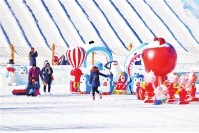活动期间,游客可以在公园内近距离观看南极企鹅,与冰雪玩偶合影,体验“雪上飞碟”等近20项冰雪游戏项目。
