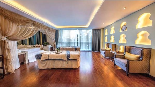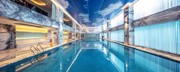 向东方花园国际酒店的温泉区域以开阔大气的建筑风格与古典园林韵味相结合,既有典雅高贵之风,也有园林自然情趣。温泉区配有甜点、时令水果、清凉饮品,可尽情享用。开阔的泳池,通透的侧光投入水池中,反射出墙面的大理石纹路,顿生蓝色氤氲无边之感,户外温泉池边的香蕉树上还挂着一大串香蕉,不知名的黄色花朵也带着浓烈的热带风情。按摩椅、玉石浴、休闲区,每一处细节都让人感到那么体贴,水天一色的超大游泳池,水温常年保持在27℃,是休闲放松的绝佳之地。
