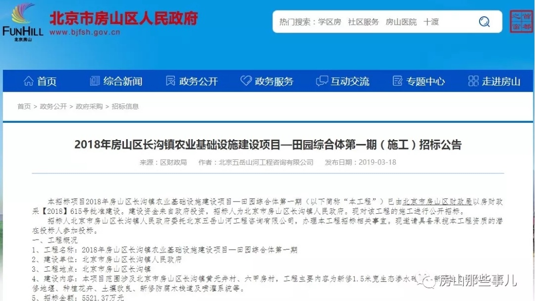 房山区政府官网发布长沟镇一田园综合体一期(施工)招标公告: