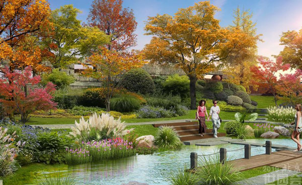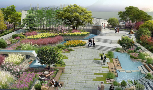 重庆素有“巴山夜雨”之称。本次植物设计以“夜来风雨声,花落知多少”为意境,取借和模拟重庆自然山谷、溪流、田园等典型山地植物景观。上层乔木参天,下层地被探水,利用植物的季相变化,营造出步移景异,多维度、多向度、多层次的山地园林景观,达到“大珠小珠落玉盘”的美妙意境。在植物造景中,以银杏、国槐、元宝枫等高大乔木为基础,在不同标高的重要节点及视线交汇处,点缀紫薇桩头、丛生石榴、独杆石榴、红枫等山地特色植物,体现在起伏不平的山地上,植物个体和群体的形式美。采用多色花境为主要植物亮点,体现山地景观的自然野趣。同时以梯田植物、柑橘等植物作为主题,展示具有地域识别和文化标识的巴渝山水、具有绿色生活的园艺创新的田园生态环境。