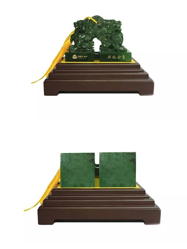 祥瑞合玺采用连珠玺的形式,合玺钮分别为龙钮和狮钮,玺钮以乳钉纹玉璧相连,龙狮身躯掩映于祥云间。龙狮都是最具中国风的瑞兽,狮因其谐音“事”,因此被赋予了喜事、好事等吉祥的寓意。整体外形如钟钮,寓意中华礼仪之邦,礼之用和为贵;钟为中国古代重要的打击乐器,以此代表邵乐,谐音民族之声(升),寓意中华民族的伟大复兴。恰逢祖国70华诞和世园会在中国举办,双玺合璧,举世期盼。限量2019方。