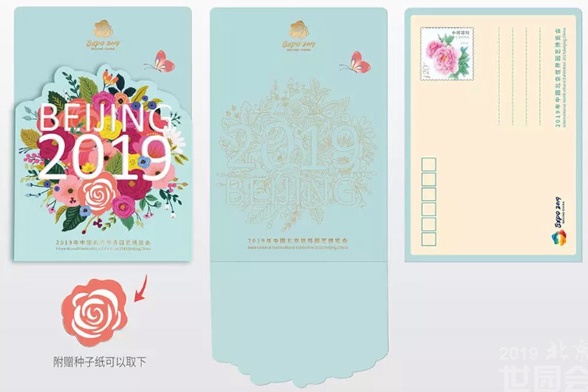 倒计时100天种子异形明信片在兼顾集邮集邮文化属性的同时,具有较强的现代设计感,整体色调清新淡雅,与花朵鲜艳的色彩对比鲜明又相得益彰,明快活泼,寓意着北京世园会满园缤纷,万紫千红。另外采用种子纸制作成一朵特别花朵附着在明信片上,种子纸是以手工造纸加入种子的一种新载体,通过这种创新设计,让公众把世园带回家,传递世园会“让园艺融入自然让自然感动心灵”的理念。