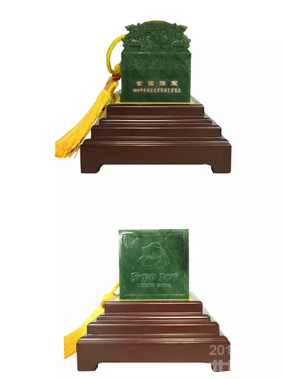 2018年12月28日,在北京世园会第二批特许企业授牌活动和特许商品精品推广活动现场,在“寄语2019”环节中,嘉宾们拿一枚由新疆和田碧玉材质手工制作的世园徽宝,以钤印的形式,通过明信片书写表达了众多人对世园活动的美好期许。活动现场还设置了丰富的体验互动环节,观众在现场领取世园寄语卡片,并亲手用世园徽宝在卡片上留下世园logo的印记,将这一具有纪念意义的卡片珍藏。活动现场,观众踊跃参与,纷纷通过钤印形式,近距离感受世园徽宝魅力,体验中国印章文化,享受世园产品的热情。