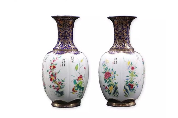 四时吉祥花卉对瓶由中国工艺美术大师、首批陶瓷美术家张松茂,中国工艺美术大师、陶瓷世家徐亚凤设计,产品设计灵感来源于北京故宫博物院藏清乾隆霁蓝地描金粉彩诗句花卉纹大瓶。对瓶颈部及近足处的霁蓝釉描金彩缠枝万福地与如意云头纹、卷草纹、回纹均提取自原物加以还原,瓶身呈六瓣瓜棱形,分别描绘了12月份花卉画面。此对瓶构思新颖,诗情画意,寓意着四季平安,满堂富贵之意。