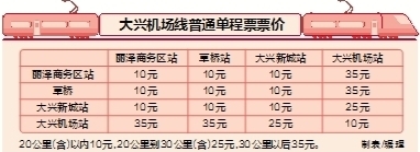 为满足不同人员的出行需求,运营方共制定4种票价。最受关注的普通单程票,20公里(含)以内10元,20公里到30公里(含)25元,30公里以后35元。照此计算,乘客从丽泽商务区站、草桥站出发,到大兴新城站、大兴机场站的票价分别为10元、35元。