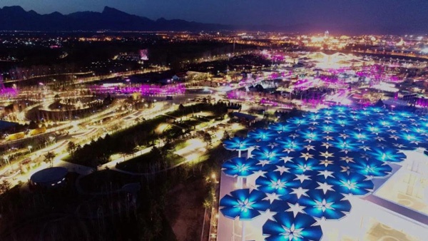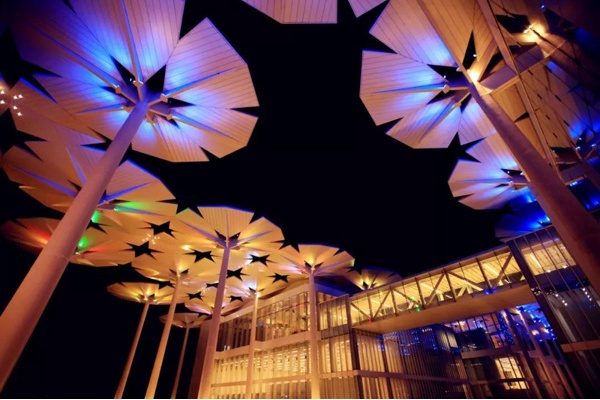 移步至国际馆,又是截然不同的感受。国际馆由94把花伞构成,如同一片花海飘落在园区里。无论是在高空俯瞰,还是在伞下信步,游客都会被这一片独特的花海所吸引而流连忘返。当夜幕降临,花伞叶片上的投射灯将会为场馆营造出多姿多彩的夜景。