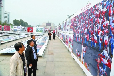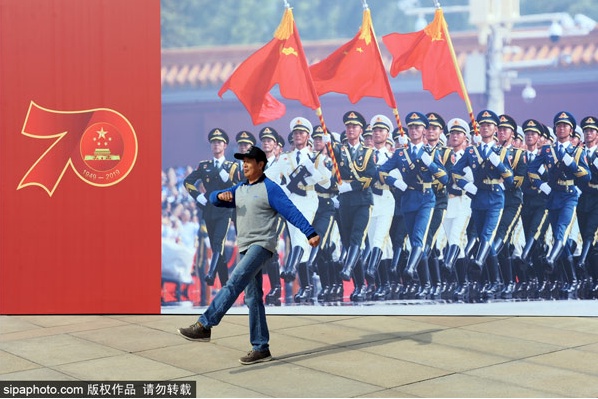 从中华世纪坛南广场南门一进入会场,首先看到的就是“腾飞的民族,辉煌的成就——全国主流媒体新闻摄影作品展”。从全国各地主流媒体的4万多幅初选作品中挑选出的500幅作品,将狭长的广场变为一条时间的河流,呈现出新中国成立70年来的辉煌成就。展览中最新的作品拍摄于今年10月1日国庆当天。纪实摄影师们当天在天安门广场及周边的不同点位记录下这难忘的一天。人们可以看到仪仗队在朝阳下进行的最后排练、看到接受检阅的空中梯队飞过天安门上空,还能看到国庆晚会焰火升腾在以国家大剧院为背景的夜色中。