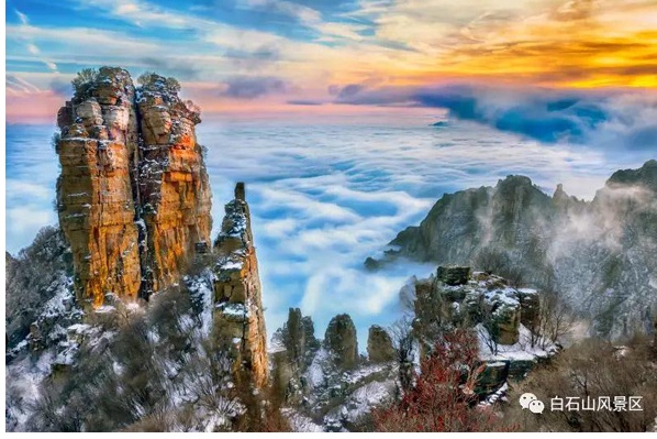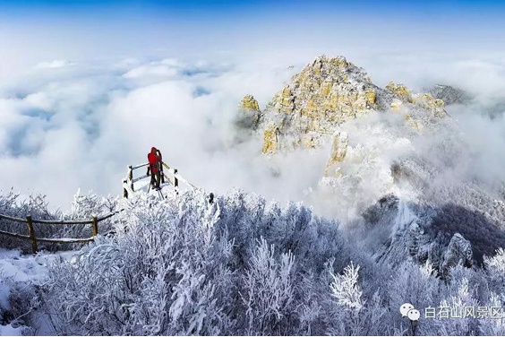 雪后白石山,幻化成银装素裹的童话仙境。雪浴群峰更显巍峨,雾凇林海独具风韵,云海翻滚变化万千,多景交融成罕见的极致雪景,令人心驰神往。
