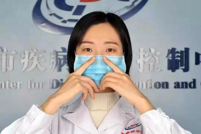清洁双手,佩戴口罩,注意分清正反面,上下拉开褶皱,压紧鼻夹。