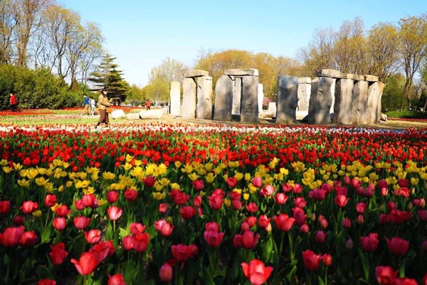世界公园巨石阵旁边的郁金香花海,散发着一阵阵诱人的芬芳。粉色的“汉斯维利”在欢快的舞蹈;红色的“水晶美人”绽放着娇艳的容颜,光彩夺目;黄色的“金色检阅”昂首挺胸,仿佛在接受检阅;白色的“维多利亚”似在轻舞云袖,翩翩欲飞。