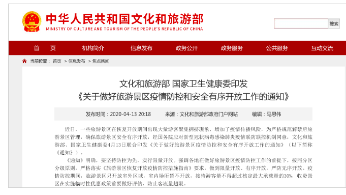 文化和旅游部、国家卫生健康委印发《关于做好旅游景区疫情防控和安全有序开放工作的通知》(下文简称《通知》)。