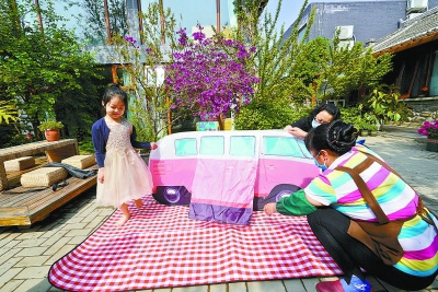 本报讯(实习记者 杨天悦)昨天下午,在通州区第五季龙水凤港农家院里的一片户外草坪上,一位年轻的父亲正和儿子踢着玩具皮球,身后的两名小女孩在野餐垫上过家家;远处一群年轻人正在草坪旁边的共享环保烧烤车跟前忙活着,香味儿不一会儿就飘满了整个场地。