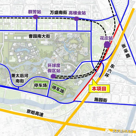 规划显示,这条道路位于环球主题公园和东六环之间,南起施园街,北至张采路。