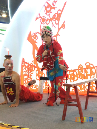 四川展台安排了川北灯戏、茶艺、歌舞等表演,吸引了众多游客。川北灯戏是国家级非遗,演员用四川话表演,形象活泼生动,引得游客拍掌叫好。同时,展区内还有现场直播,介绍各市州的旅游资源。