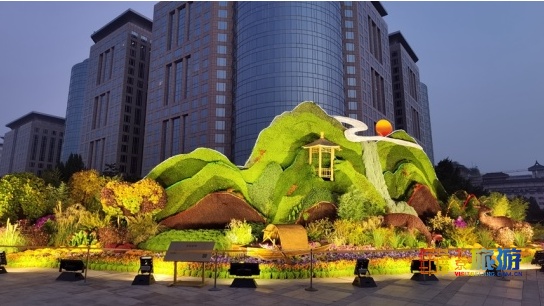 东单西北角花坛以“生态文明”为主题,花坛顶高8.5米,以祖国锦绣河山为主景,生动展示绿水青山就是金山银山的生态文明理念。