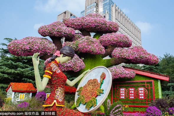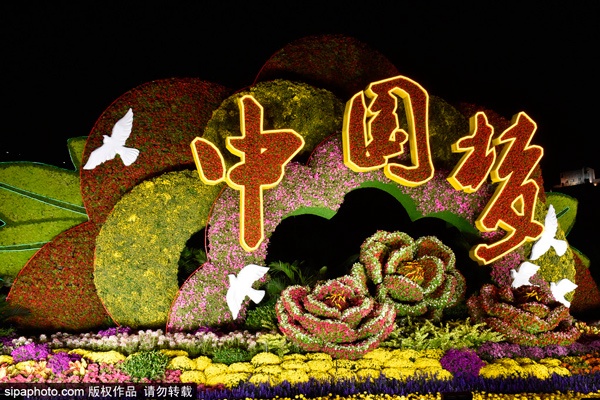 复兴门东北角布置“复兴伟业”花坛,花坛顶高8米,以盛开的繁花为主景,嵌有“中国梦”字体,展示出百花齐放共襄复兴伟业的美好祝愿。