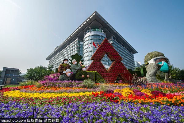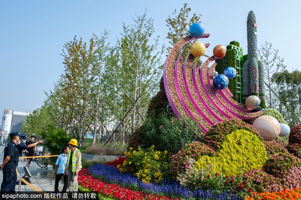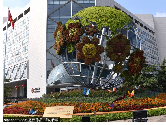 西单西北角布置“命运共同体”主题花坛,花坛顶高9米,以笑脸组成的花链围绕着地球为主景,体现全世界人民携手共创美好繁荣的未来。