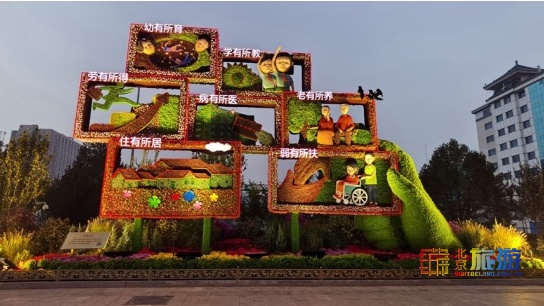 东单西南角布置“安居乐业”主题花坛,花坛顶高8.5米,以百姓安居乐业为主景,体现出了十九大报告提出的“幼有所育、学有所教、劳有所得”等民生“七有”的美好愿景正在实现。
