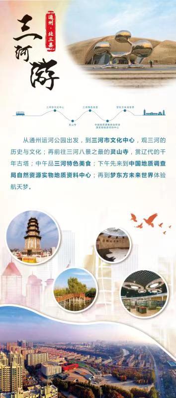 从通州运河公园出发,到三河市文化中心,观三河的历史与文化;在三河八景之最的灵山寺,赏辽代的千年古塔;中午品三河特色美食;下午先来到中国地质调查局自然资源实物地质资料中心;再到梦东方未来世界体验航天梦。