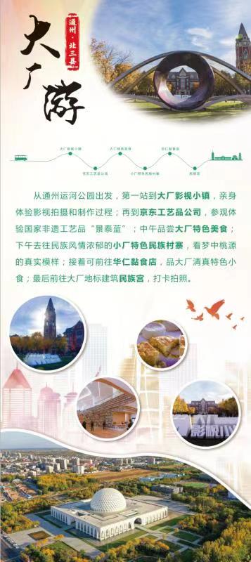 从通州运河公园出发,第一站到大厂影视小镇,亲身体验影视拍摄和制作过程;再到京东工艺品公司,参观体验国家非遗工艺品“景泰蓝”;中午品尝大厂特色美食;下午去往民族风情浓郁的小厂特色民族村寨,看梦中桃源的真实模样;接着可前往华仁黏食店,品大厂清真特色小食;最后前往大厂地标建筑民族宫,打卡拍照。