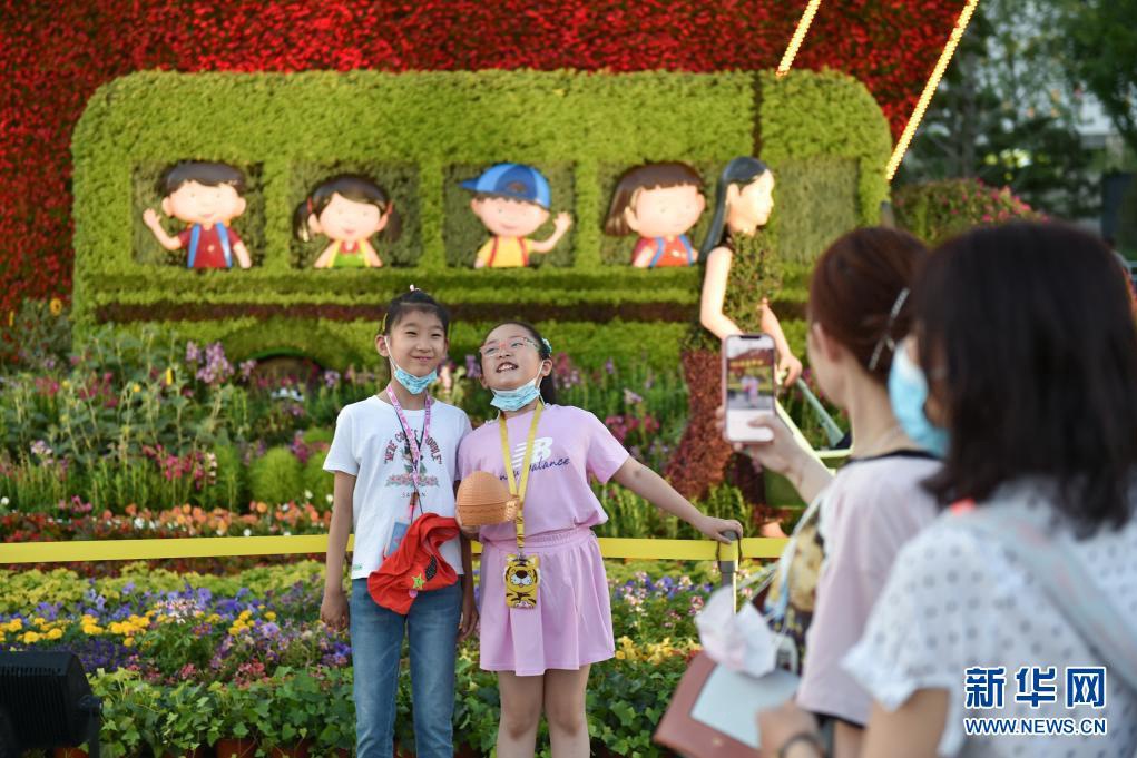 6月19日,市民游客在位于东单路口的花坛景观前拍照留念。