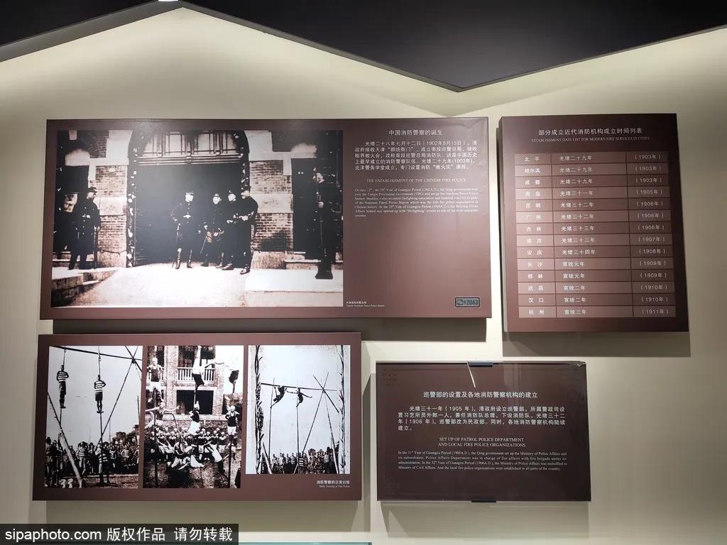 三层为近代消防展厅。介绍了我国历史上最早建立的消防警察队伍,陈列了各式各样的消防器材。