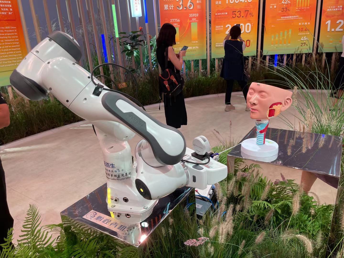 一只机械臂灵活转动,精准但轻柔地手持棉签,在模拟的人类鼻腔中完成采样,这是中国研发的全球首台自动化核酸采样机器人。“通过人工智能视觉技术和运动规划系统,机械臂有了‘眼睛’,可以精准定位到被采集人面部和鼻孔,精确控制力度完成鼻咽拭子采集。”展区工作人员介绍。